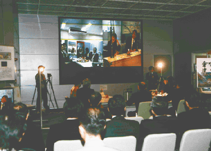 セレモニーは、学長、副学長を始め学内関係者と会津青年会議所、会津坂下 町関係者等約100人が出席しておこなわれました。また、デモンストレーション として、実際に大学と西会津町のCATV、郡山市のハイテクプラザ、沖縄県 さらには、遠距離伝送実験として、米国クパチーノにあるNTTアメリカ 「ネットワークセンター」とを結んだ実験が行われました。