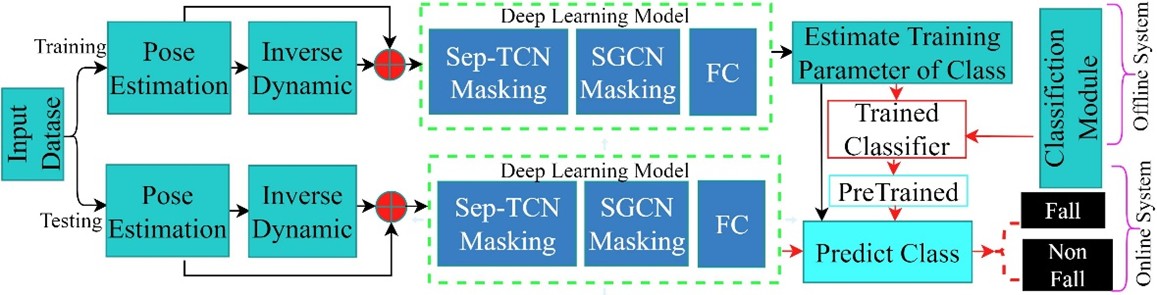This research aims to overcome the limitations of traditional wearable devices and vision-based fall detection systems, such as low accuracy due to occlusion or lighting conditions. The proposed method utilizes a Graph Temporal Convolutional Network (GTCN) model and calculates Inverse Dynamic Force using OpenSim to enhance feature efficiency. By employing Sep-TCN (Separable Temporal Convolutional Network) in the deep learning model, the system reduces computational complexity and parameters, enabling it to function effectively in both offline and online environments.