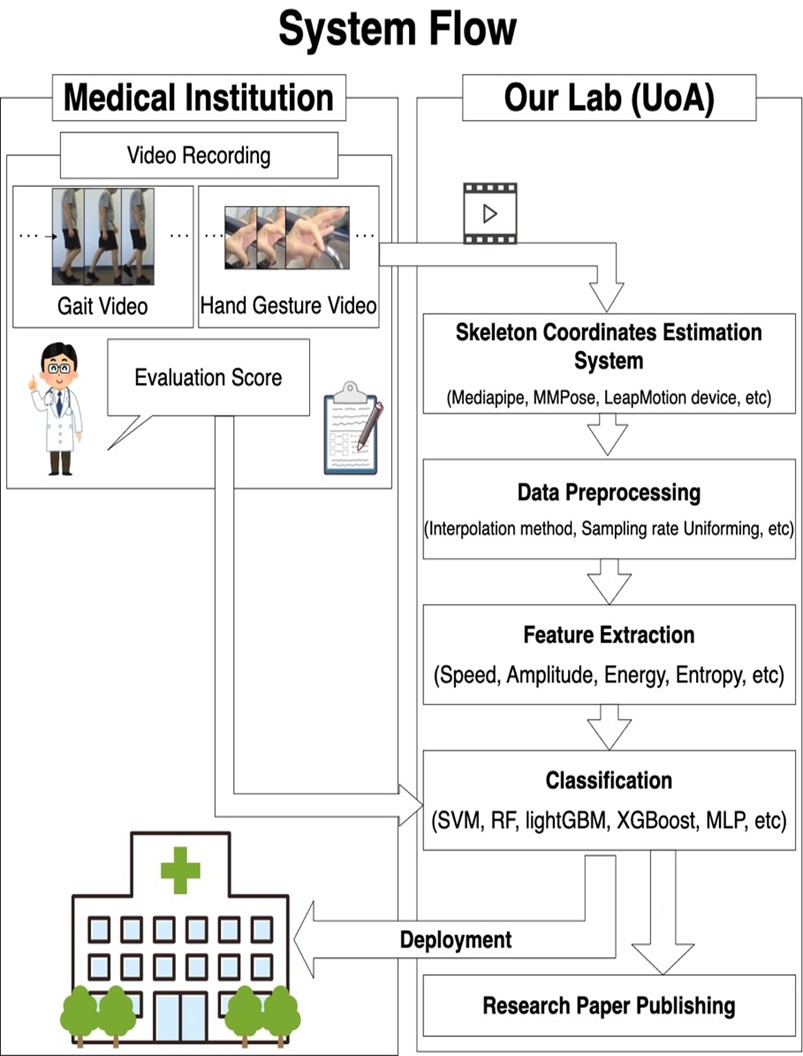 パーキンソン病(PD)と非定型パーキンソンニズムの識別という課題に着目し、本研究では多クラス分類モデルに加え、浮動小数点ベースのスコア評価を行う回帰モデルを提案します。既存の整数ベースの評価よりも高い予測精度を目指すとともに、通院が困難な患者のための客観的な症状観察ツールとして機能させ、治療中の微細な変化の記録を可能にすることを目指します。