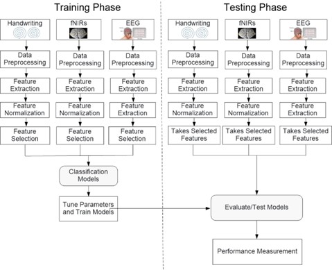 本研究は、筆跡パターン、fNIRS(機能的近赤外分光法)、およびEEG(脳波)信号から抽出されたデータを用いた、機械学習ベースの小児ADHD診断システムを提案します 。生データから統計的および非線形特徴量を抽出し、最適なチャネルとバイオマーカーを選択することに焦点を当てており、これまで研究が少なかった機械学習による筆跡分析や効果的なチャネル選択といった課題に取り組みます 。選択された特徴量を用いて予測モデルを訓練し、ADHD児と健常児の判別を行います 。