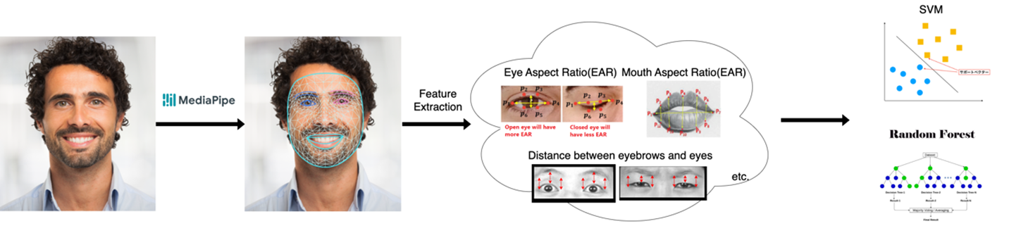 本研究は、計算リソースの使用を最小限に抑え、エッジデバイス上で効率的に動作するように設計された、機械学習ベースの表情分類アプローチを導入します 。このシステムは、MediaPipeを使用してフェイスメッシュを検出し、目のアスペクト比(EAR)や口のアスペクト比(MAR)などの識別可能な幾何学的特徴を抽出します 。重い深層学習モデルの代わりにSVMやランダムフォレストなどの機械学習アルゴリズムを利用することで、推論速度を向上させ、背景や肌の色の変化に対する堅牢性を維持します 。