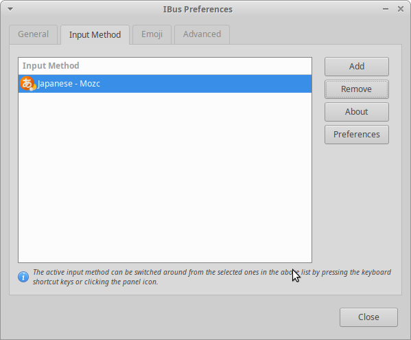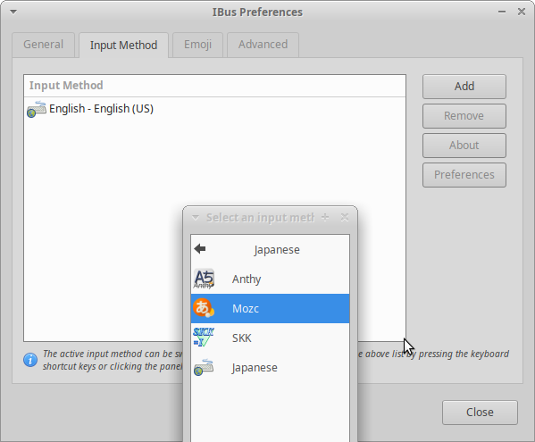 "IBus Preferences" メニューを開き、Input Methodタブを開き、Addボタンを押します。