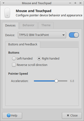 "Mouse and Touchpad"の設定画面では、有効・無効の切り替えや、カーソル速度の変更などができます。